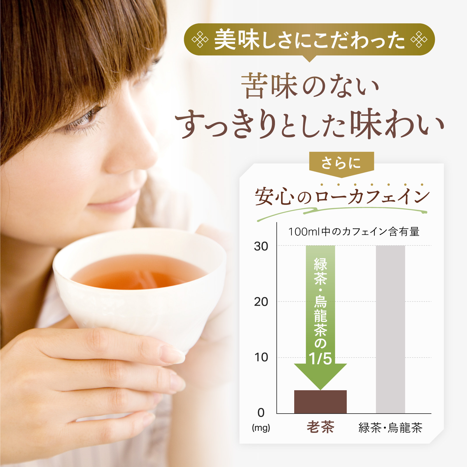 どんなに効果のあるダイエット茶でも、続けるのが大変では意味がありません。「美味しくて飲みやすい」「自然に毎日続けられる健康茶」とし て約40年親しまれてきた老茶。 毎日のお食事や飲み物で、身体の中から美しく健康に。