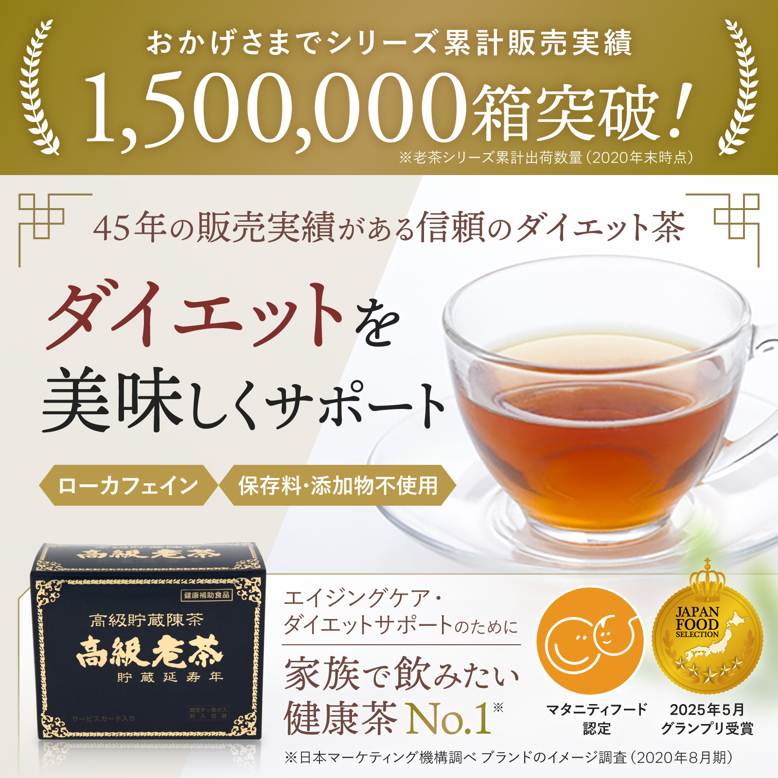 高級老茶は共栄の健康茶の中で最も売れているお茶です。ドラッグストアや薬局で、先生方から お客様にお勧めしていただき、おかげ様でこれまでにたくさんのお客様の健康なダイエットをサポートしてきました。